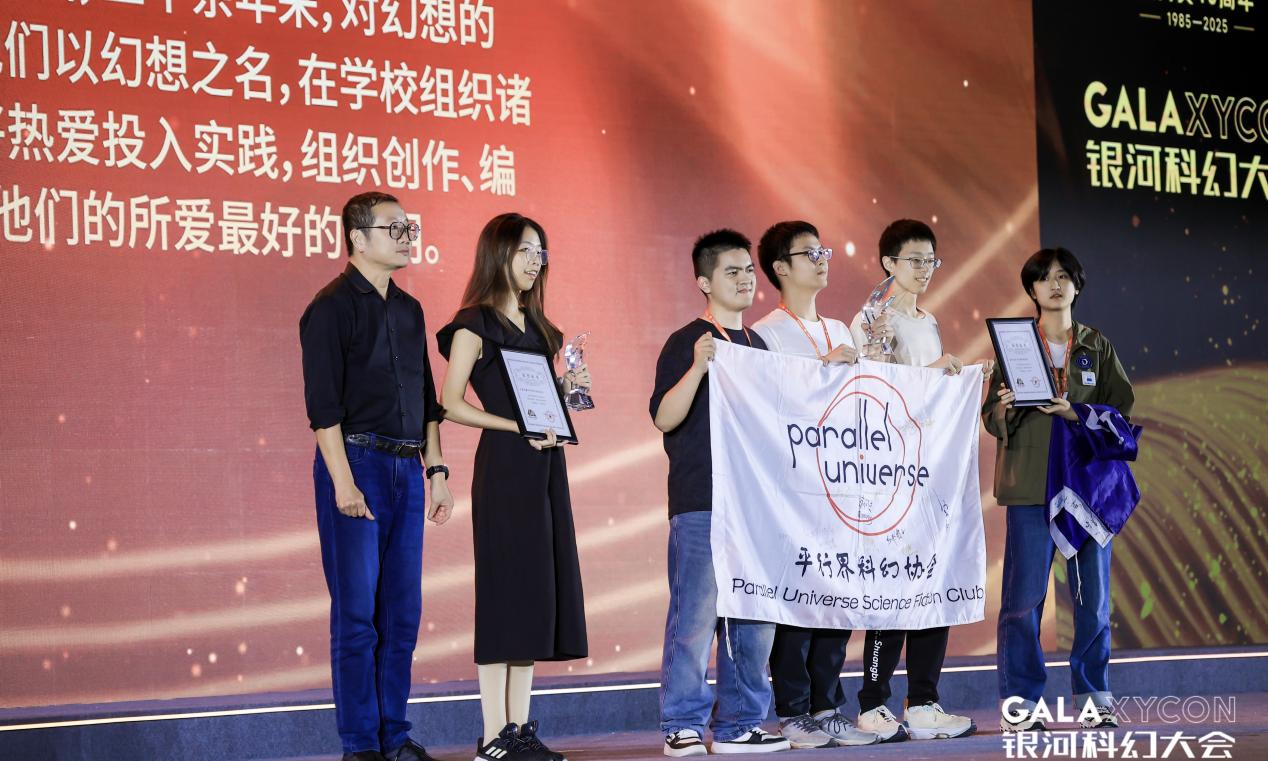 平行界科幻协会自成立以来,始终坚持以“激发想象、连接未来”为宗旨,积极组织科普活动、主题沙龙、科幻观影、作家讲座等活动,已逐步成长为上海地区具有影响力的高校科幻社团之一。银河奖系我国科幻界权威性和影响力的奖项之一,自1985年设立以来,始终致力于推动中国科幻文学的发展。颁奖典礼上,获奖员工代表从中国知名科幻作家刘慈欣手中接过奖杯。会议期间,他们还参加了由银河奖组委会主办的全国高校科幻社团联谊沙龙,与来自武汉大学、华南理工大学、哈尔滨工业大学等高校科幻社团代表深入交流,围绕社团运营、科幻创作孵化、校际合作等议题展开讨论。